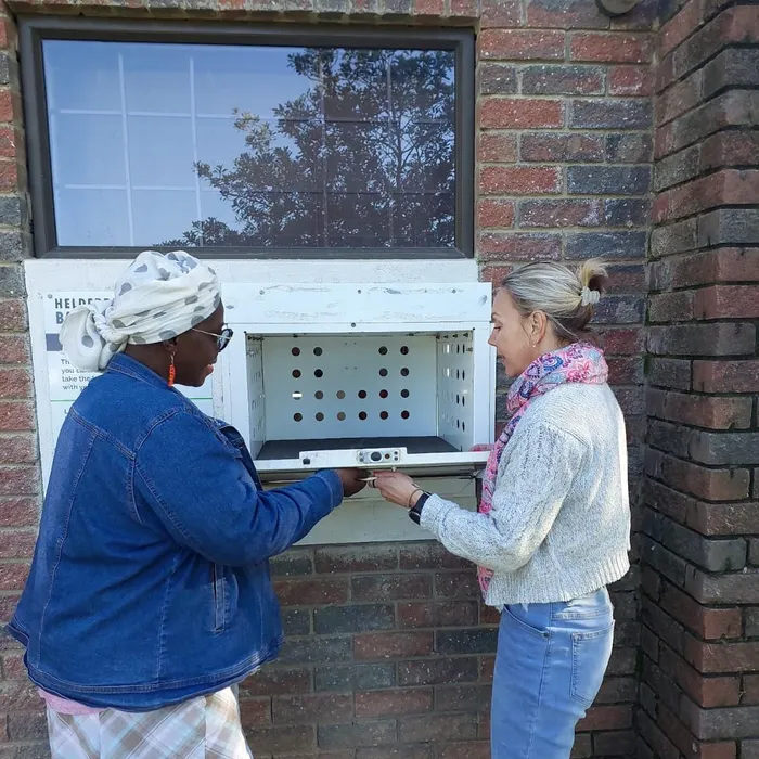 Responders, Phumi September, left, and Frances Fuchs posing in front of the Helderberg Baby Saver.