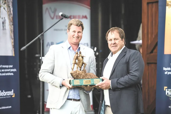 Johann de Wet of De Wetshof, left, presents the Pon van Zyl trophy to Vinpro chairman Anton Smuts, right.