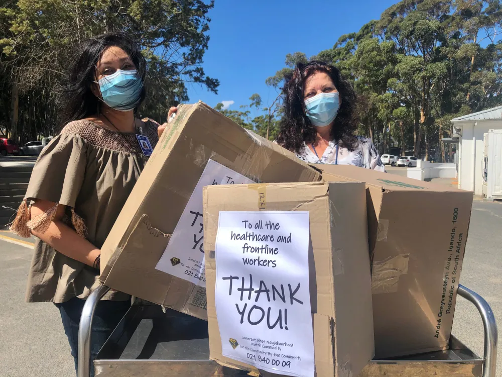 Sharon Leo, the CEO of Helderberg Hospital, and Anita Theron, quality manager at Helderberg Hospital, were most grateful to the community, and said that it makes an enormous difference to the healthcare workers to receive messages of thanks and a special treat.