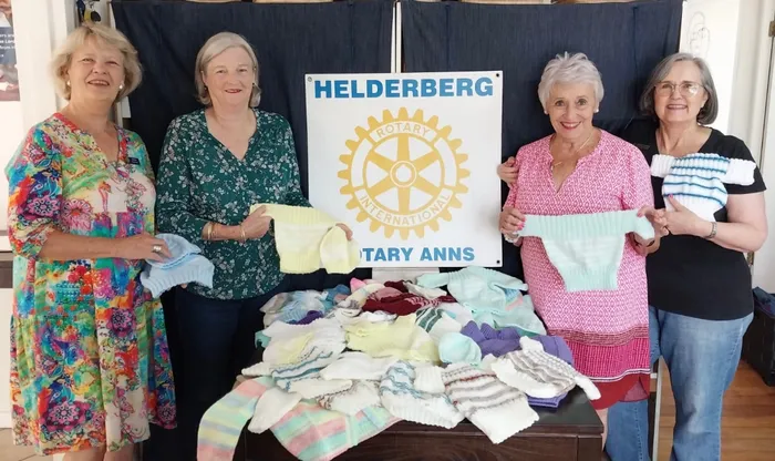 The Helderberg Rotary Anns donated a large amount of wool and beautiful baby jerseys and beanies to Mama Themba. At the handover from left, are Helderberg Rotary Ann Mieke MacDonald, Kathy Boonzaier, Ingrid Edelson and Mama Thembe Manager Lindi Officer.