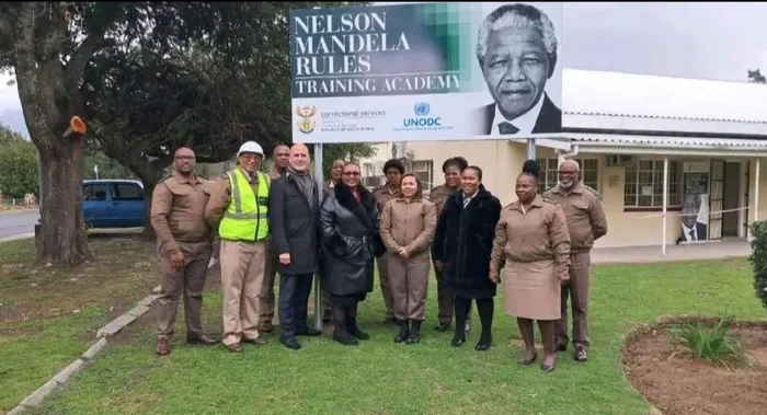 Officials from the Department of Correctional Services standing in front of the Nelson Mandela Rules Training Academy.